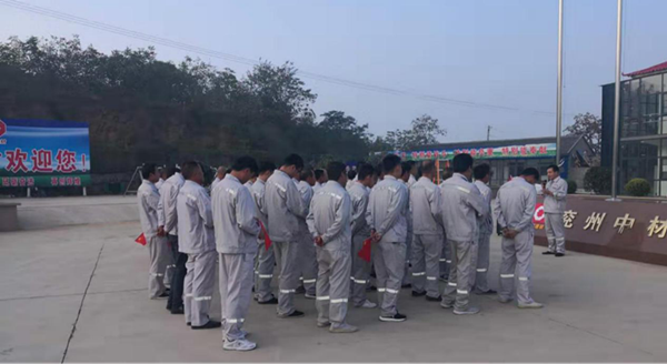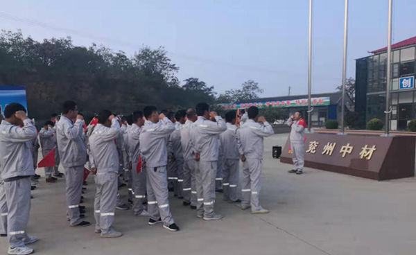 “全體肅立,行注目禮,升國旗,奏唱國歌!”伴隨著嘹亮的國歌,五星紅旗冉冉升起,兗州中材蘭陵分公司全體人員,莊嚴肅靜,目光隨著紅旗升高。旗升至頂,全體人員注目禮畢,高呼“我愛你中國,祖國萬歲”。